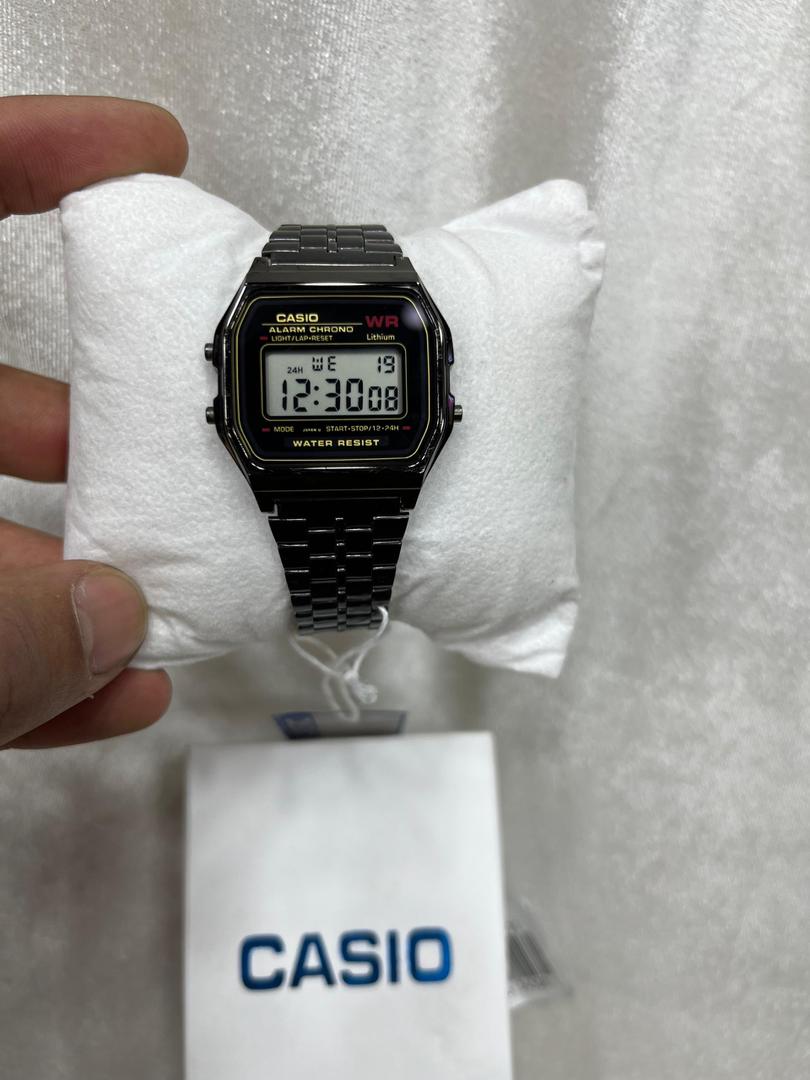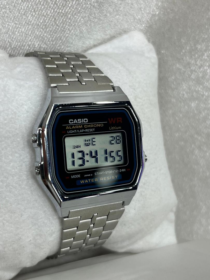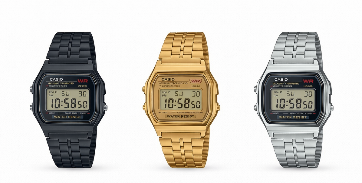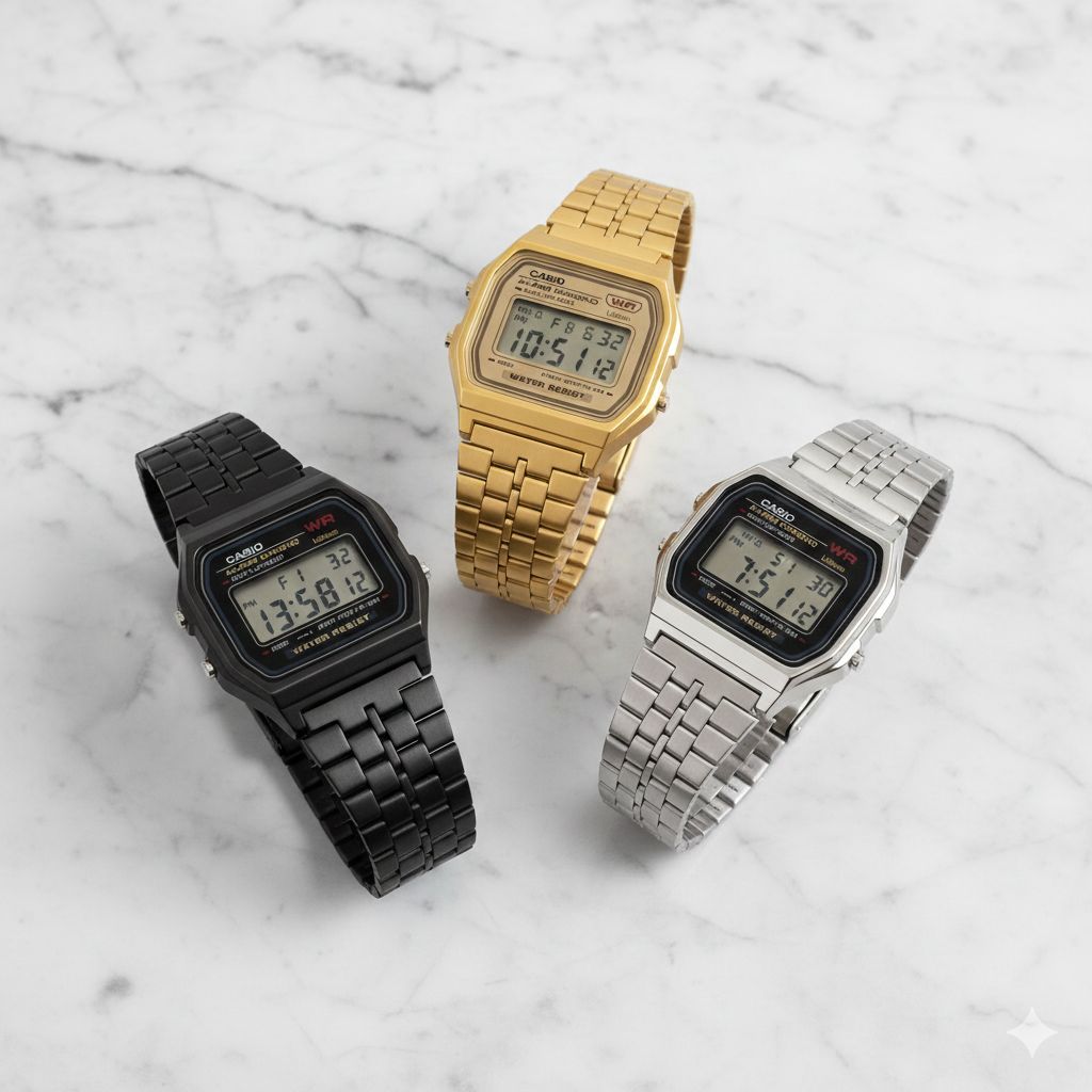 تأتي هذه الساعة بتصميم كلاسيكي معدني لامع يجذب الأنظار منذ الوهلة الأولى، مع شاشة رقمية واضحة تذكّرنا بعصر السبعينيات الذهبي. كل تفصيل فيها — من الأزرار إلى الإطار الرفيع — صُمّم ليحمل هوية